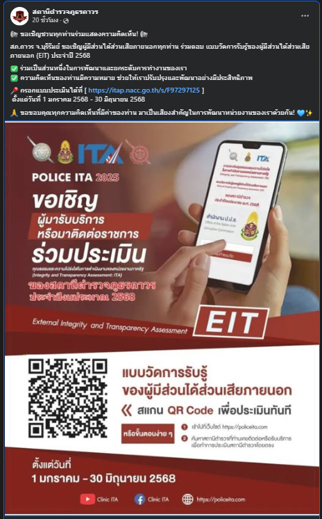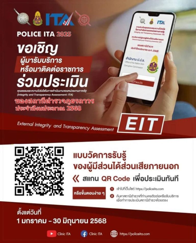3.เจ้าหน้าที่ ตำรวจสถานีตำรวจภูธรถาวร แนะนำ พี่น้องประชาชน ประชาสัมพันธ์และเชิญชวนผู้มารับบริการ/มาติดต่อราชการ ทั้งในและนอกสถานี ตอบแบบสอบถามผู้มีส่วนได้เสียภายนอก (Enternal Integrity Transparency Assesment : EIT) 2025 สำหรับนำไปพัฒนาปรับปรุงการให้บริการของสถานีตำรวจ โดยการสแกน QR Code ที่ได้จัดทำขึ้นเพื่อประชาสัมพันธ์